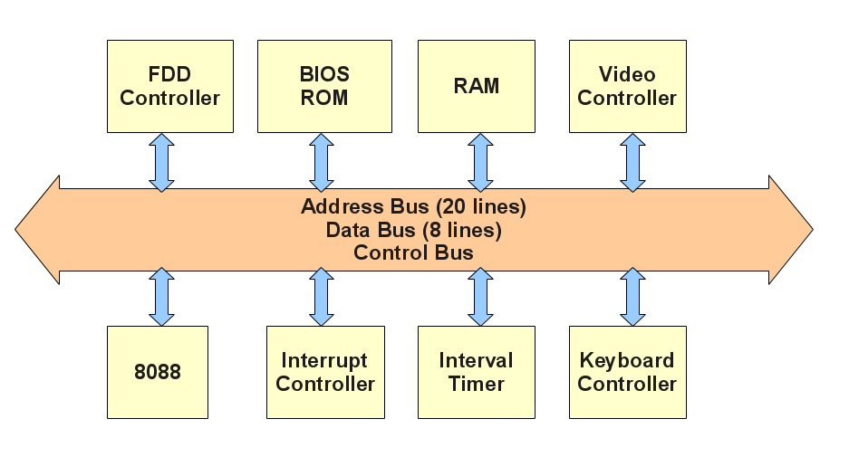 وحدات الإدخال والإخراج: احتوى الكمبيوتر على مجموعة من الوحدات المختلفة، مثل بطاقة العرض وذاكرةROM لتخزين بايوس (سيتم الحديث عنهم في الفصول المقبلة)، ووحدة للتحكم في محركات الأقراص المرنة Floppy Disk Controller، ووحدة للتحكم في لوحة المفاتيح Keyboard controller، ووحدات أخرى سيتم التحدث عنها في المقالات الآتية.